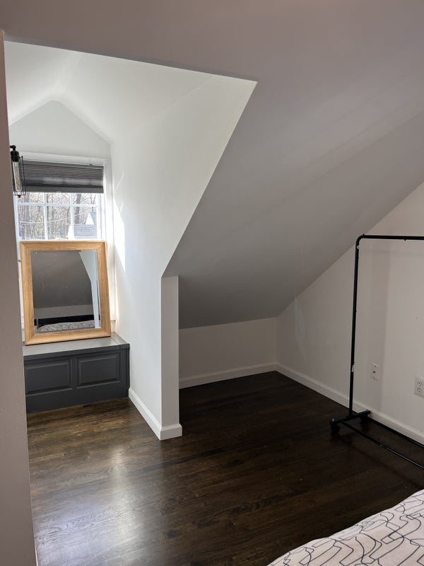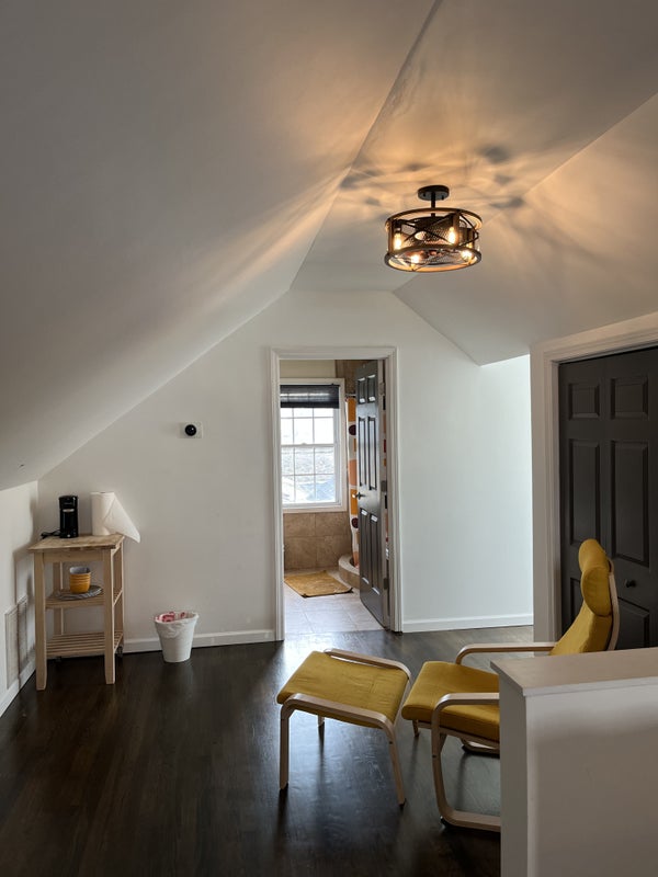 This is a renovated, fully furnished upstairs bedroom/studio with private bathroom. The area includes the entire upstairs. You'll share an entrance with me, but your space is entirely private and includes a mini fridge and microwave. Shared kitchen, laundry room, living room, and backyard with grill. Cats okay if kept upstairs.