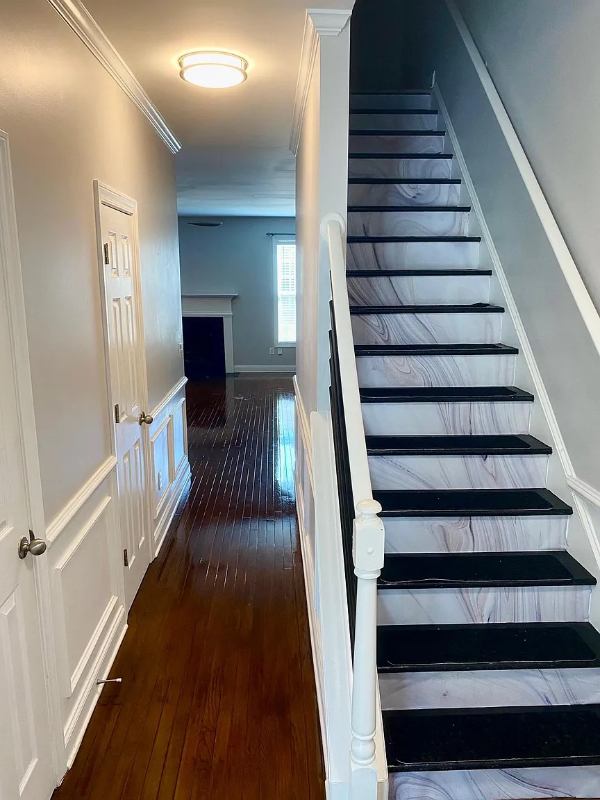 This luxurious story townhome is oneofakind! The dramatic Custom Industrial Accent Wall in the huge living room sets the tone for this fun and funky renovation. Hardwood floors throughout the main level. The Galley kitchen has white quartz countertops, duo color cabinetry and Stainless Steel appliances. Wainscoting and crown molding in separate dining room, foyer and hall way.