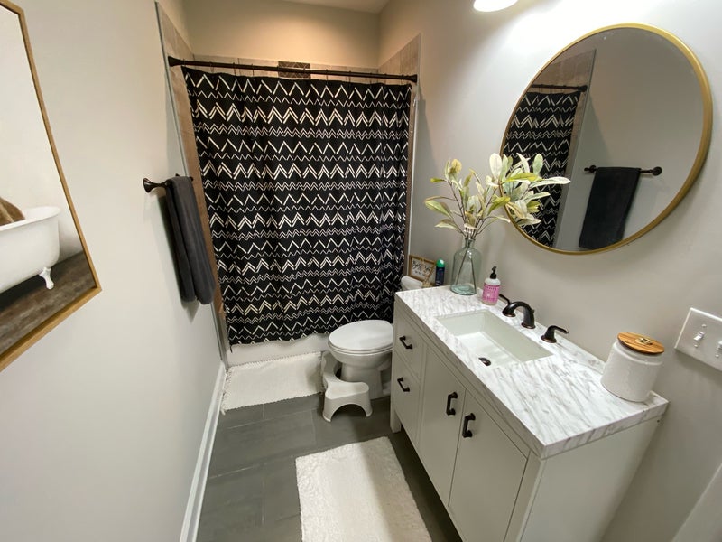 Beautifully furnished private bedroom with a bathroom available in a clean, quiet, well maintained home. Built in 2020, ranch style house with all brand new appliances. Very open spacious living room and kitchen area. Comes with washer and dryer and parking. Has basement for storage and a studio space if your a creative person. The bedroom is already furnished and has its own private bathroom. Big back yard with Firepit and a patio for relaxing and BBQing.