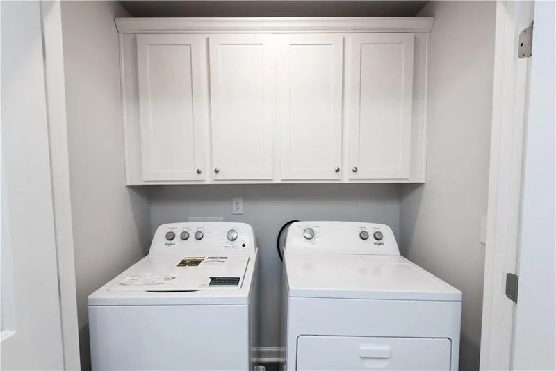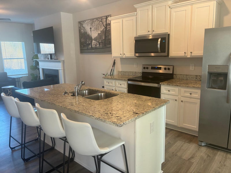 The lavish gourmet kitchen boasts granite countertops, crisp white cabinetry & a spacious island with undermount sink!