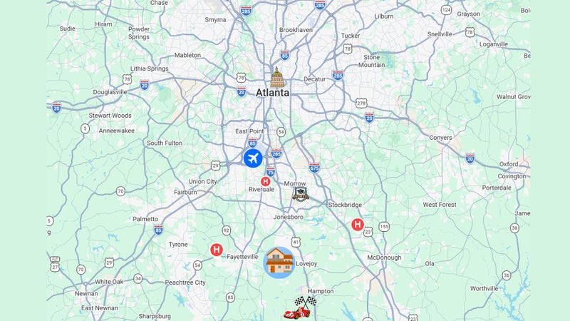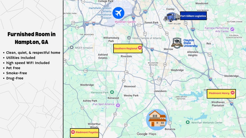 Downtown Atlanta (24 miles), Atlanta Airport (20 miles), access to I-75/85 & I-285, Piedmont-Fayette, Piedmont Henry, and Southern Regional hospitals (all 10 miles), Clayton State University (10 miles), Echo Park Speedway (7 miles), grocery stores, restaurants, and Marta nearby
