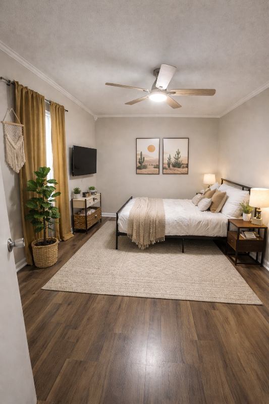 Photos are staged for marketing purposes. Room layouts reflect the actual space; furnishings may vary.
