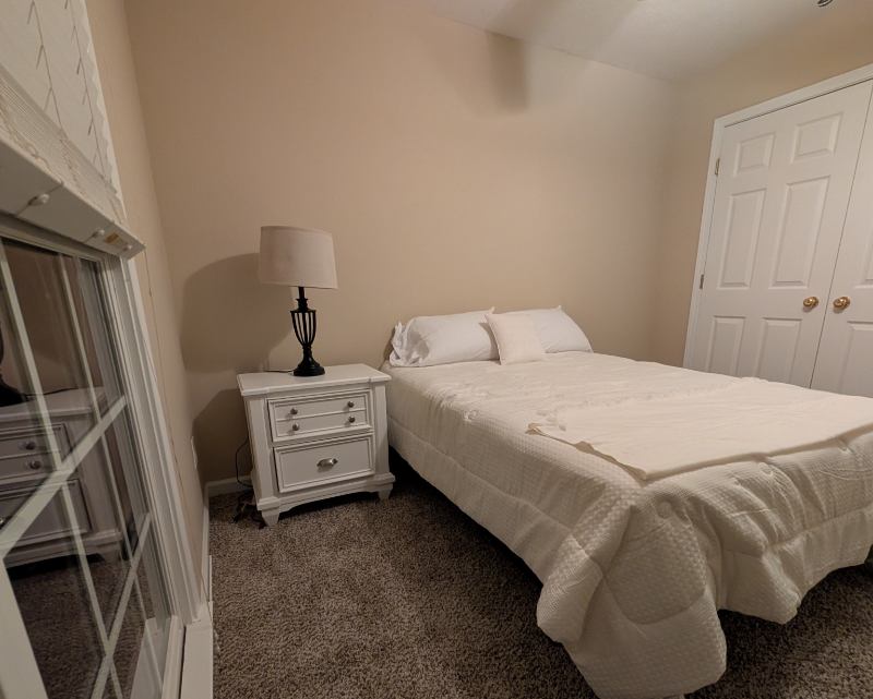 Bedroom is located to the left of either the front door, or garage entry. Walking through the living room, take another left and this room is straight ahead with hall bathroom on you right. This room is a spacious x room. Full size bed, computer desk, night stand, lamp, full size double door closet. Laundry basket and small trash. Shared hall bathroom. Direct access to shared living room, dining room, computer desk, kitchen and kitchen eating area. Includes access to all home furnishing in common areas described on house rules, including appliances and utensils for eating and cooking.