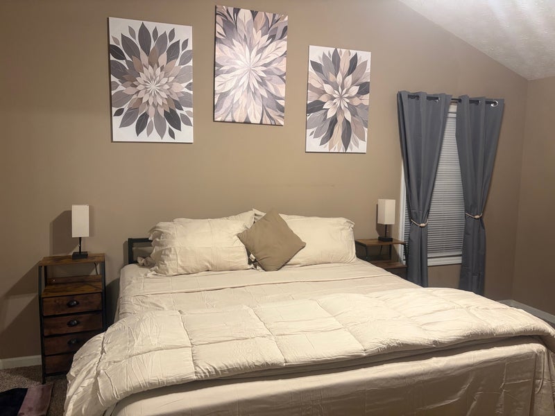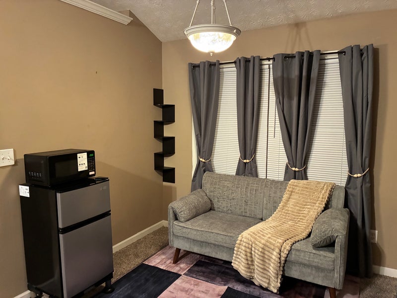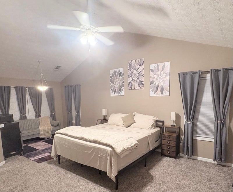 This private suite with private bathroom This ranch style home has no stairs and is handicapped accessible! The suite comes FULLY furnished with a California king size bed, 65 in tv and a seating area with sofa. There is a refrigerator and microwave in provided in the suite. Both the bathroom and closet are very spacious. The bathroom has a walk-in shower and jacuzzi tub. All utilities are included with WiFi and household cleaning supplies.