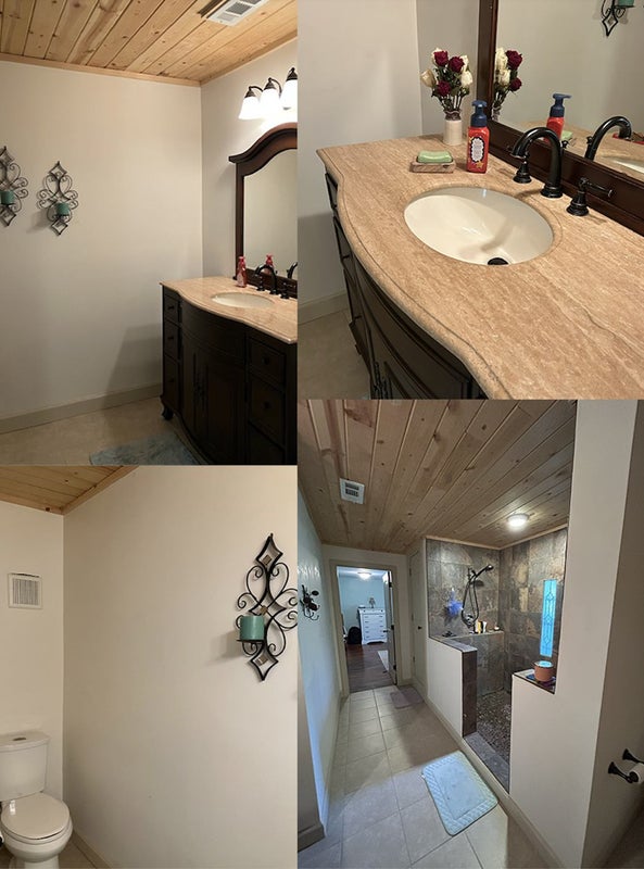 🛏️ ROOM + PRIVATE BATH * Large window w/ beautiful pasture view * Huge bathroom – walk-in shower + toilet room * Closet in room + additional bathroom closet * Original 1940s refurbished hardwood floors * Pine plank ceiling, marble vanity – the prettiest room in the house