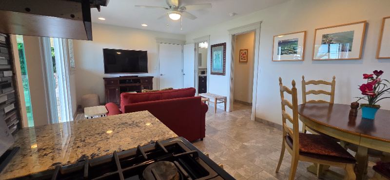 The living room features an open floor plan full kitchen, dining area and slider to garden area for outdoor seating. The spacious primary suite includes a large slider closet and bathroom with tub.