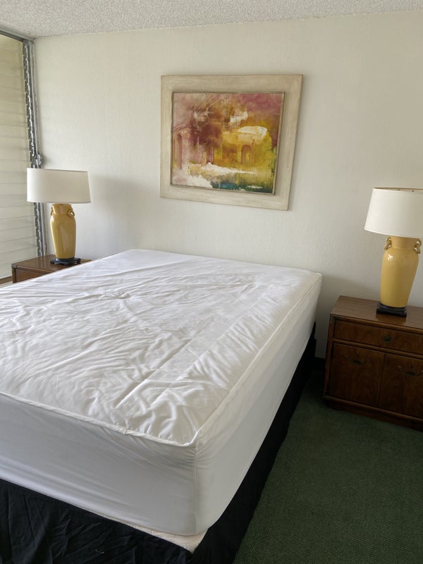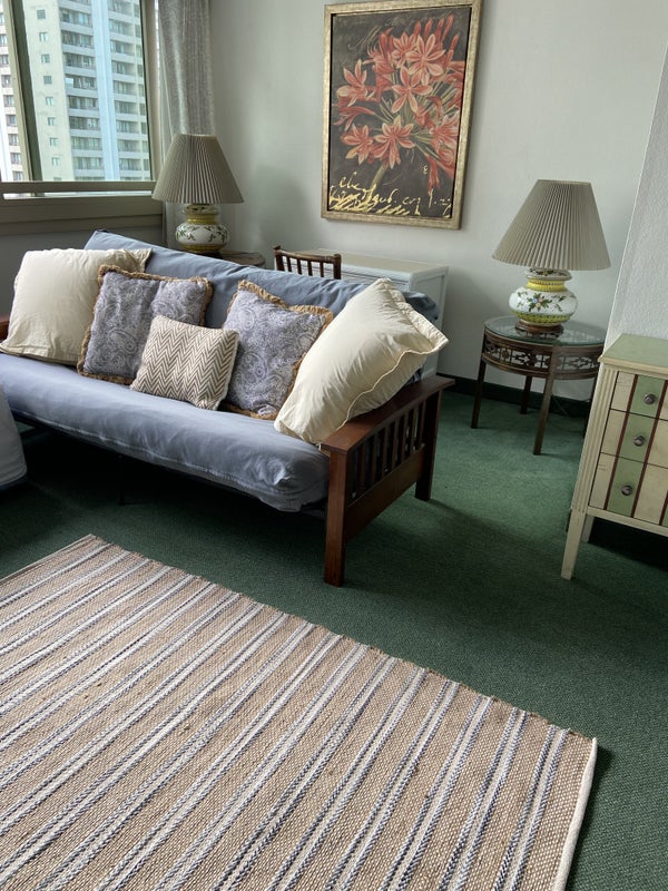 Unit has wonderful natural cross breeze, AC in bedroom and Queen size bed, with a futon sofa in the living room.