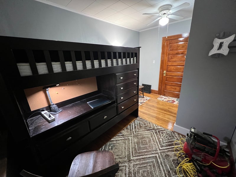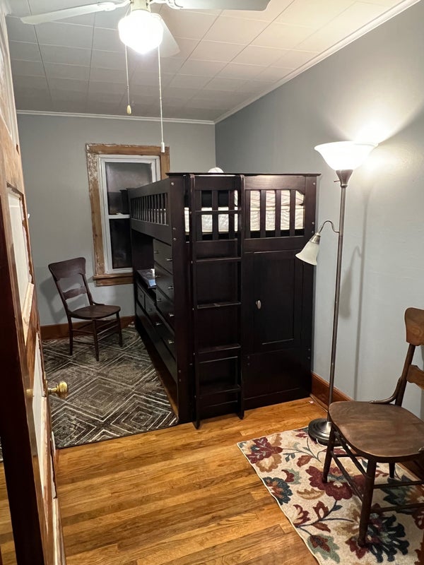 Small bedroom available for rent. Comes with 2 windows, a fan, a loft with a desk underneath and storage attached to it, a closet, and 2 roommates. The loft can be taken apart and put into storage if you have your own furnishings.