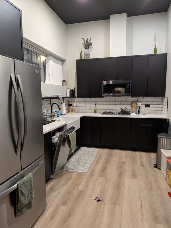 High ceilings and lots of counter space in the kitchen w/ dishwasher.