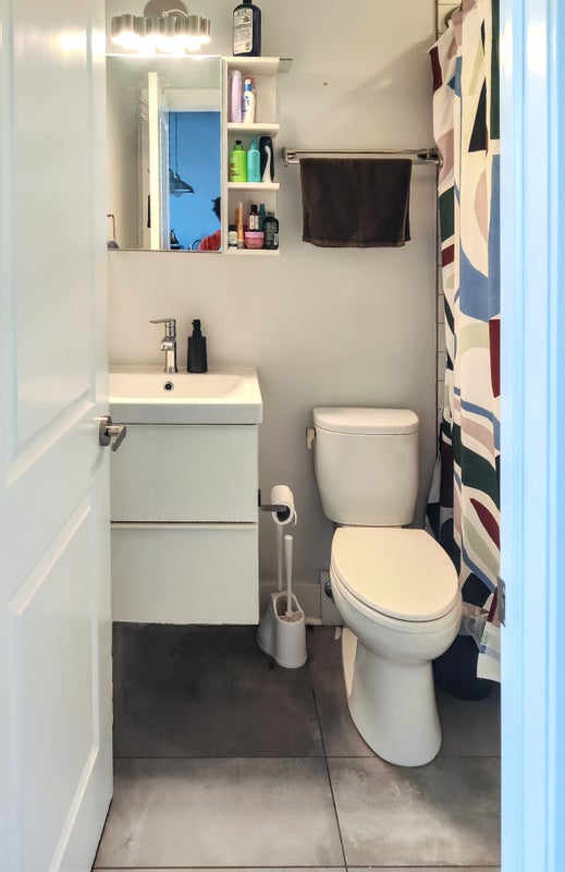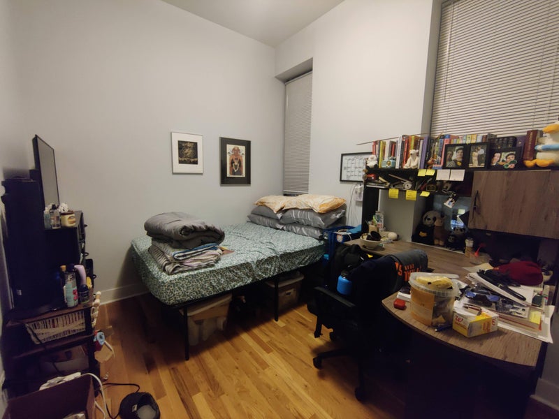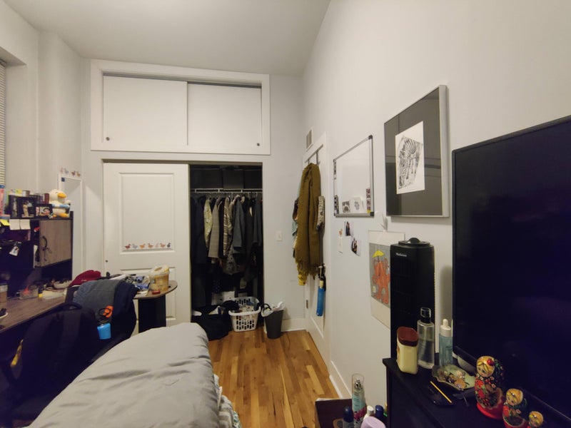 The apartment has a living room with an open kitchen and one shared bathroom. You will have the smaller room, which can comfortably fit a queen-sized bed. It also has a closet and an overhead storage space. The apartment also comes with a dishwasher and an in-unit washer dryer. It has central air conditioning and heating. Utilities (wifi, gas, and electric) will be split between you and the current tenant and they come up to ~ $60-70 per month. The apartment is sparsely furnished, since the current furniture belongs to me and I will be taking it to my next apartment.