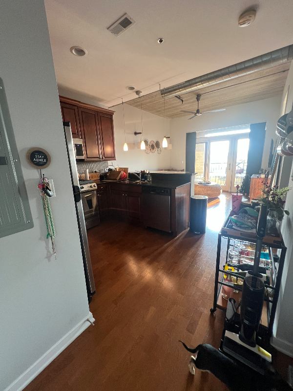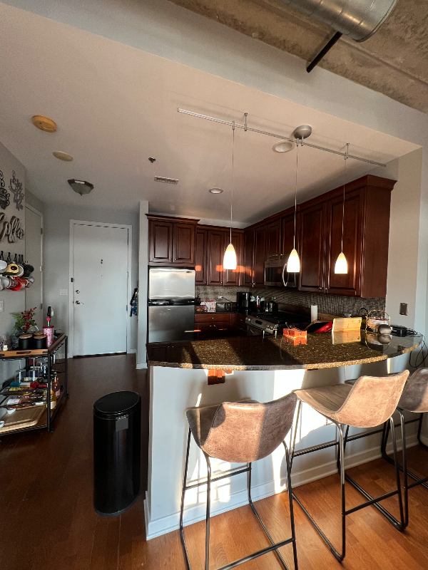 For Rent: Charming bed bath Condo in the heart of Downtown Palatine. Location, Location, Location. This building is in the heart of downtown. Just steps to the Metra and several bars and restaurants within walking distance. The unit is located on the rd floor. Spacious bedroom and walk in closet. Balcony with gorgeous sunset views. Industrial style with foot ceilings Well kept building. In unit laundry. One heated garage parking spot. Kitchen with tons of storage and new refrigerator (not pictured). The monthly rent of $. includes heat, water and internet. Renter pays electric. $application fee and if accepted, $ security deposit, $ non refundable building deposit and $ move in fee will required upon signing of lease. Available September through August . First months rent will be prorated. No pets.