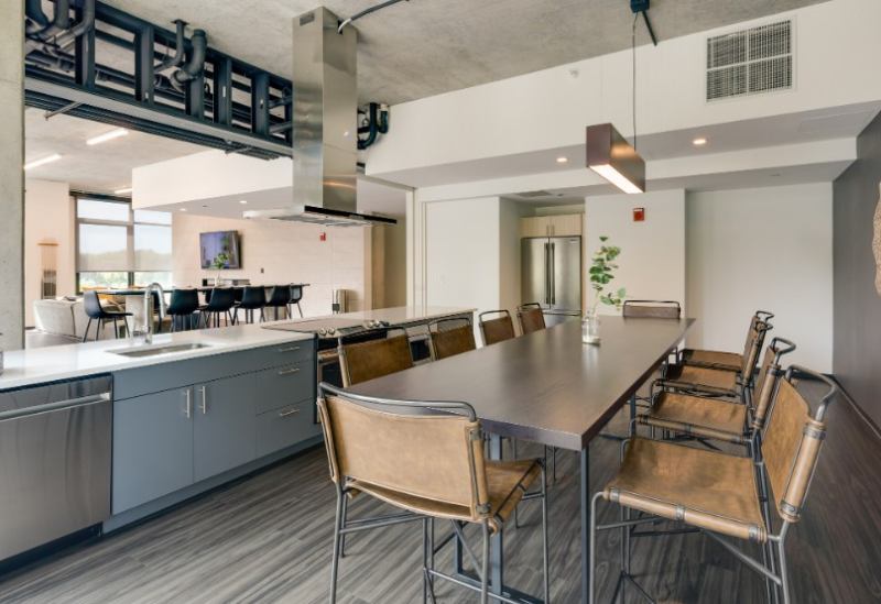 Amenities include two outdoor terraces, outdoor grills, fire pits. Inside, a party room and resident lounge, complete with a chef's kitchen, and a gym with a Peloton Bike.