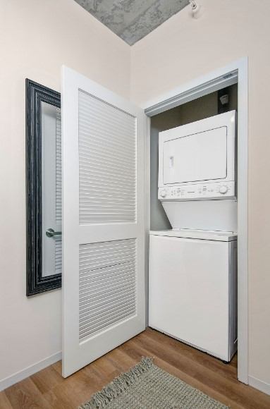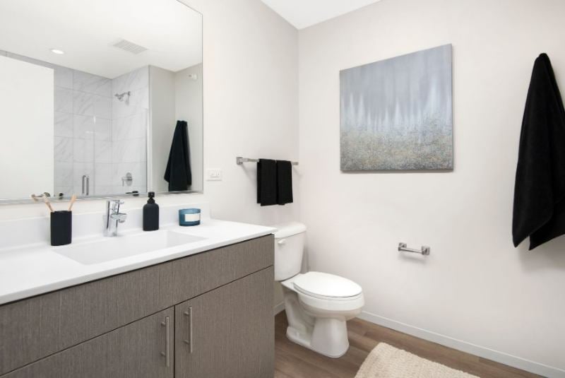 Apartments here are bathed in natural light thanks to the floortoceiling windows, perfectly complemented by the tall, exposed concrete ceilings. Thoughtfully designed kitchens are equipped with Europeanstyle cabinetry, quartz countertops, and stainless steel appliances. The bathrooms with their Grohe fixtures and spacious vanities with frameless mirrors are both stylish and functional.