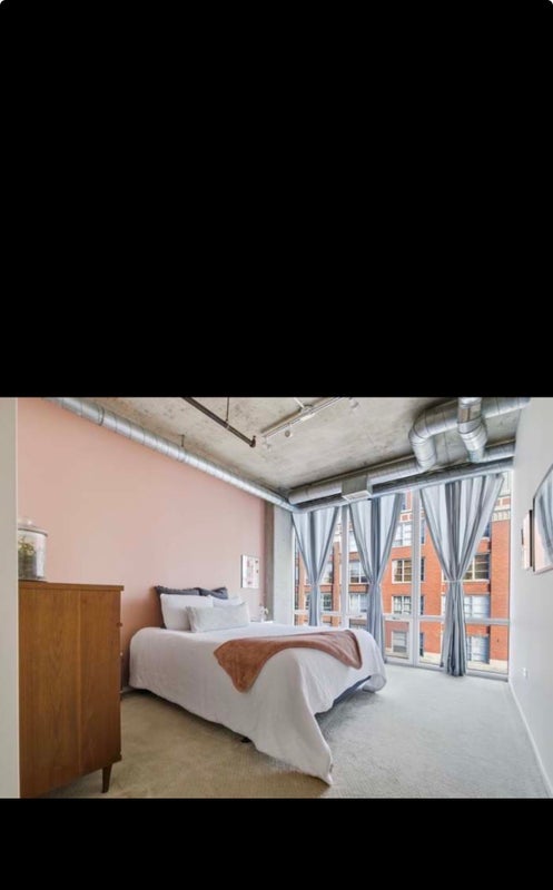 Spacious 1-bedroom concrete loft in the vibrant West Loop featuring 10' ceilings and oversized east-facing floor-to-ceiling windows offering abundant natural light and city views.