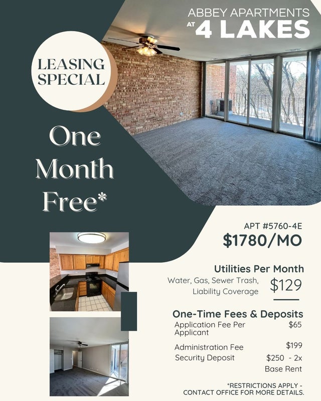 Abbey Apartments at Four Lakes has history — and offers something even better: space to live at your own pace. Comfortable apartments with character, peaceful views, and a location that keeps you connected without all the noise. Whether you're starting fresh or simplifying life, this is a place to settle in and make it yours. Surrounded by mature trees and connected ponds, Abbey feels tucked into its own wooded corner of Four Lakes — calm, grounded, and removed from the rush. Yet just minutes from I and I, you’re seamlessly connected to Naperville, Schaumburg, Rosemont, O’Hare, and the greater Chicagoland area. It’s the kind of location that works with your life, not against it. Schedule your tour today and experience the balance for yourself..