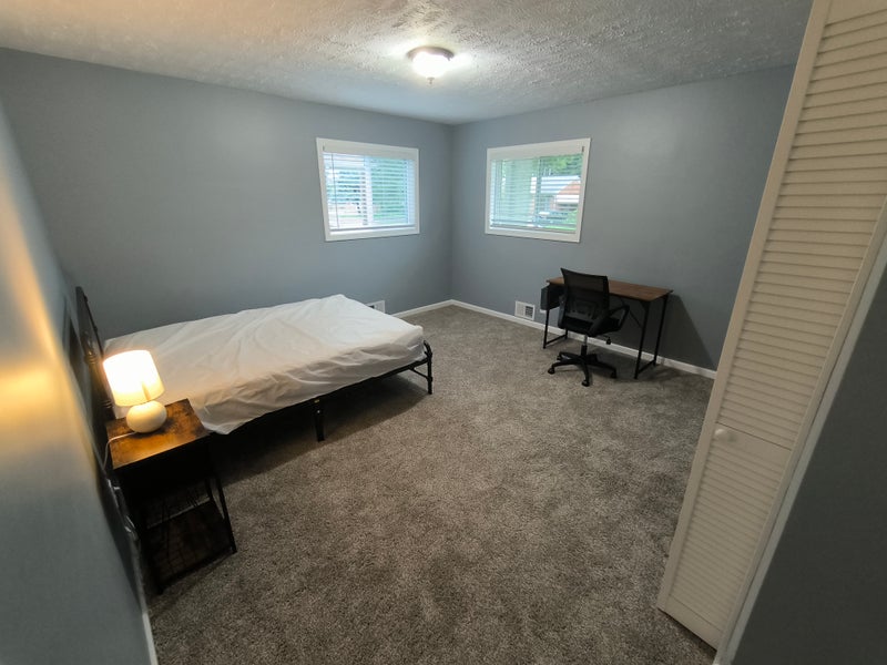 Full size bed frame, mattress, mirror, nightstand, lamp, desk and office chair provided. BYO bedding.