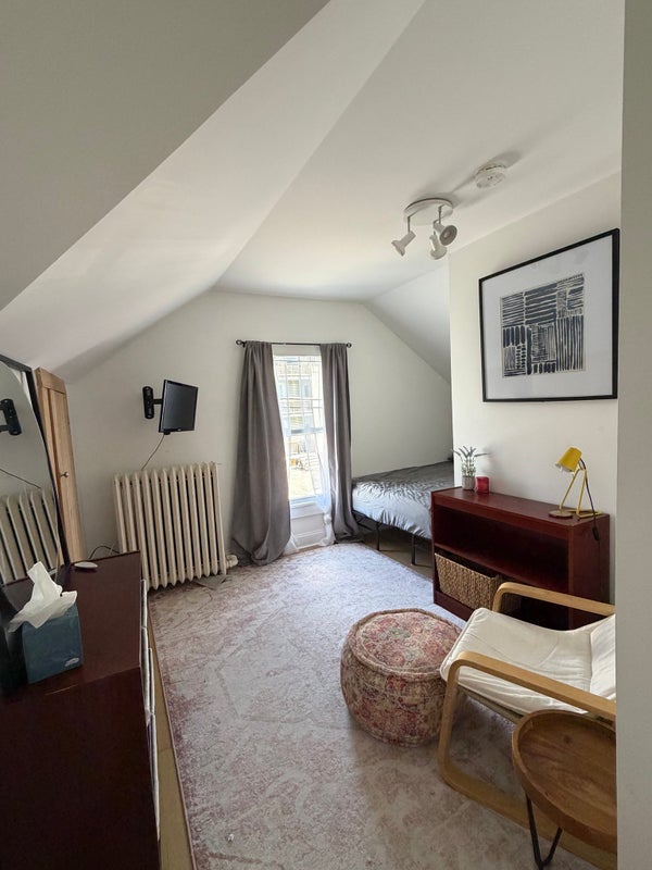 Shared washer and dryer in basement, small dishwasher. Tv in kitchen and living room. Bathroom includes bathtub. Quietish neighborhood, friendly neighbors, elementary school within walking distance.