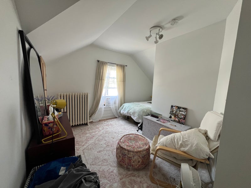 Sunny room available in a single family home. Closet in room, hardwood floors throughout, bathroom is directly across hallway from available room, skylight in hallway outside of room, house is two floors with recent renovations throughout house. season sun room. spot in driveway is included. House has a fully fenced in yard with a pergola and some outdoor seating. Corner lot, lots of sunshine.