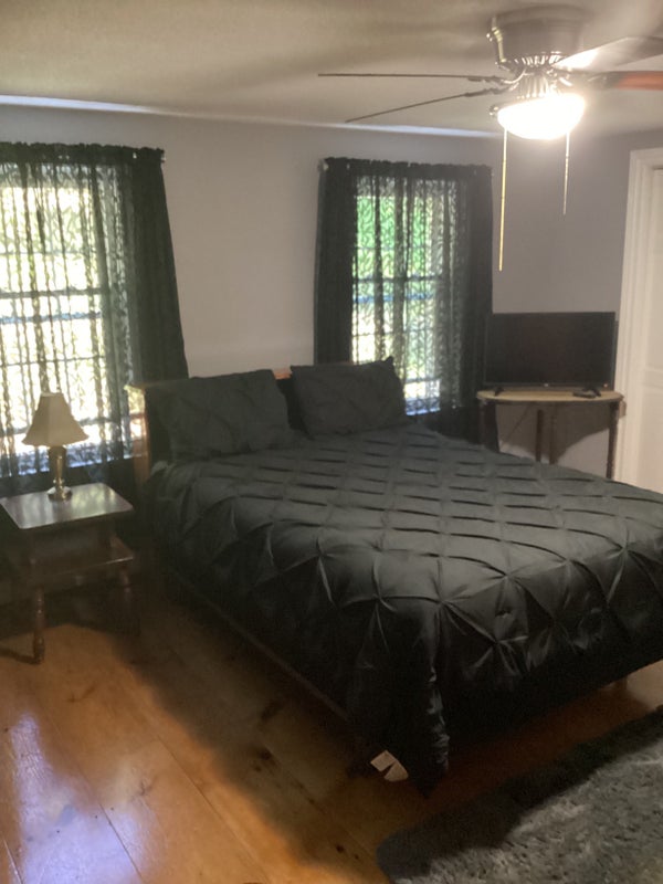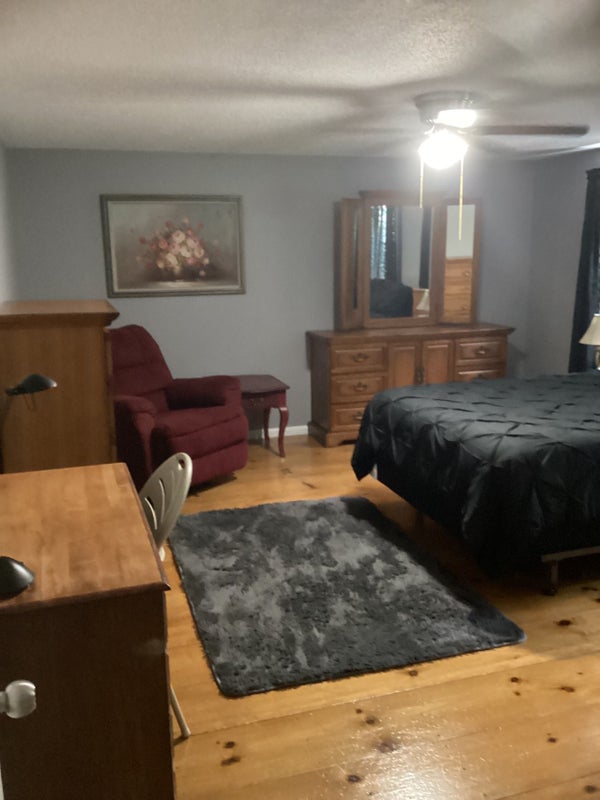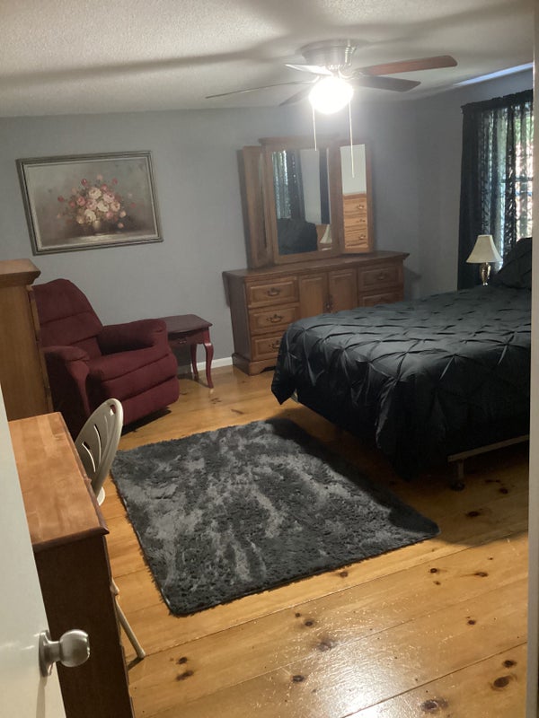 Spacious completely furnished room for rent with semi-private bathroom Home has a lovely white railed front porch with wicker furniture and tables...and a garden gazebo on the side of the house for extra outdoor seating. Room includes: Hardwood flooring, baseboard heat, air conditioning, electricity, Wi-Fi and a 55” Roku Smart TV, Hulu, Netflix, Prime, double bed, nightstand, tall bureau, also bureau with a triple mirror, rocking recliner, end table, floor lamp, desk and or kitchen set, refrigerator, microwave, toaster, coffee pot, and a double large closet. This is a quiet home and perfect for someone that would like to study or read, or possibly a retiree that enjoys the peacefulness and tranquility of living in the country.