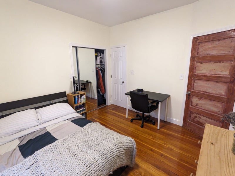 The room is fully furnished, with wardrobe, desk, bedside tables, and a bookcase. Washer and dryer in the building.