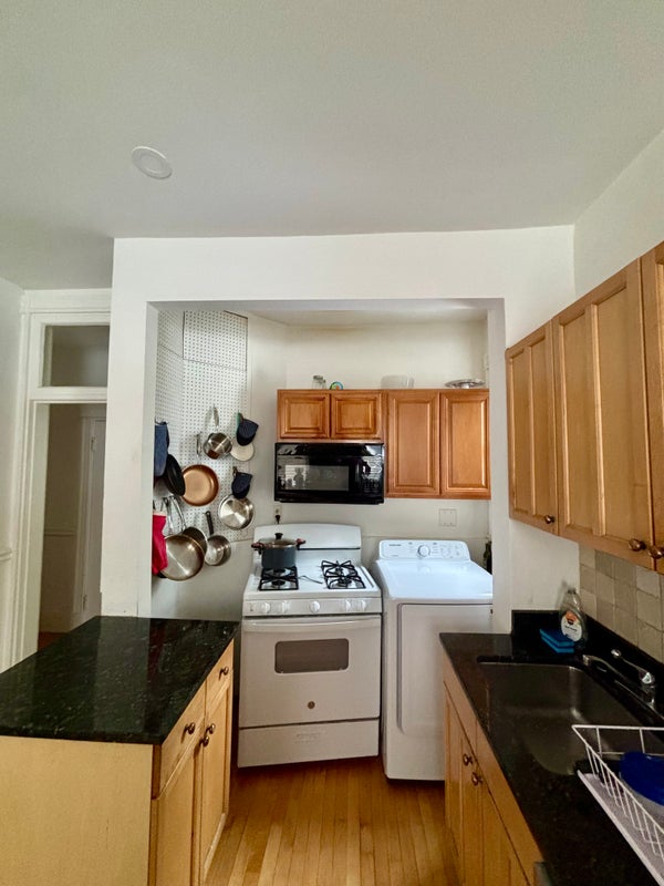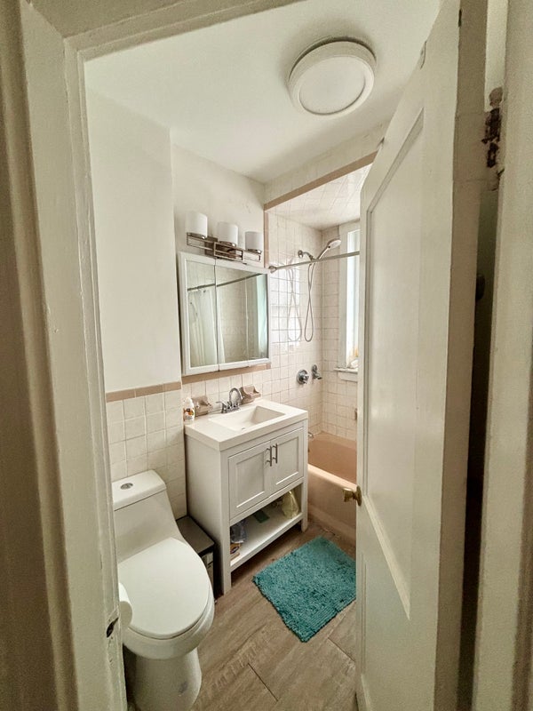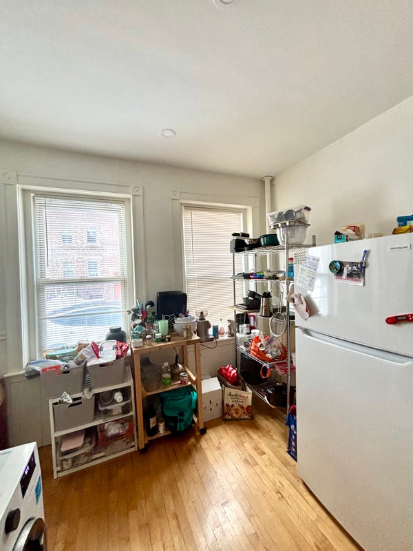The apartment has a bathroom shared with two other rooms, a kitchen with in unit washer and newly replaced dryer, as well as a living room with a dining table, couches, and a TV. We also have a patio for the summer, and extra storage space downstairs.