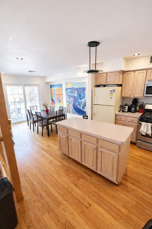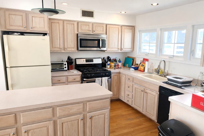 Updated kitchen appliances including gas stove, oven, microwave, and dishwasher