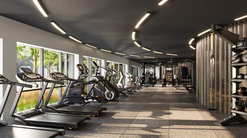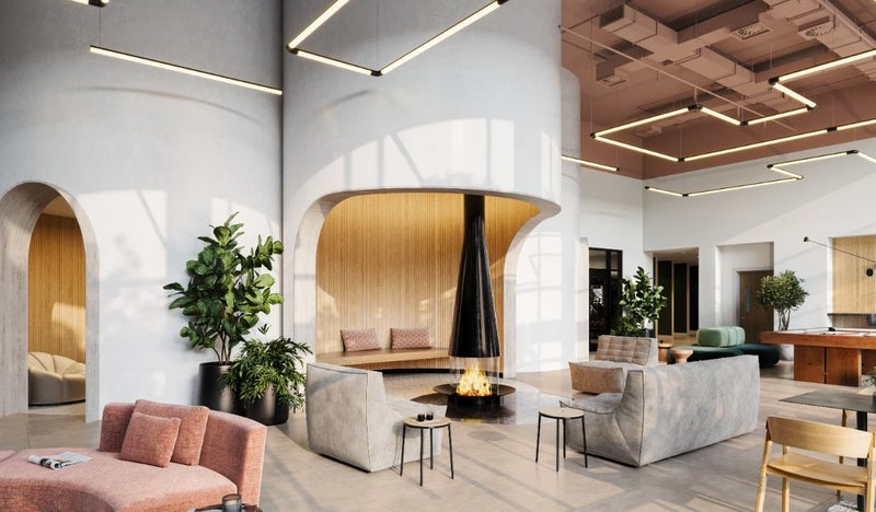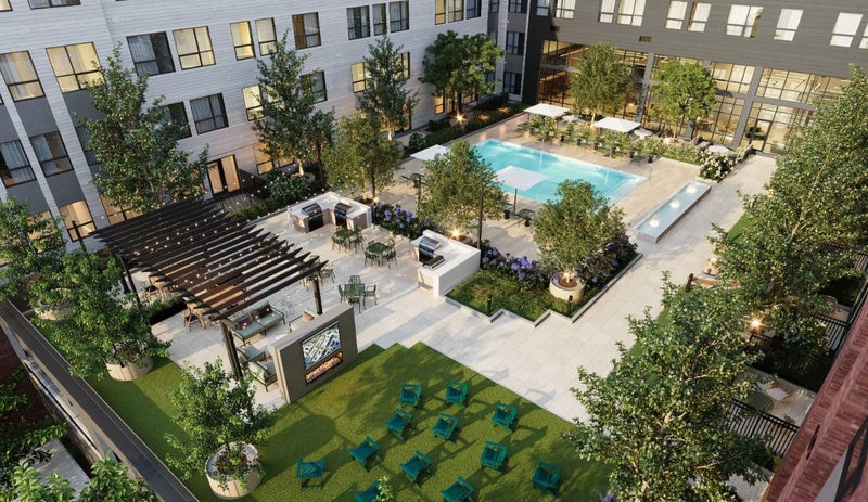 Building amenities include a pool with cabana seating, fitness center, yoga studio, co-working pods, conference room, music room with piano and recording equipment, courtyards with fire pits and grills, putting green, pet spa, and a private bus shuttle to Station Landing.