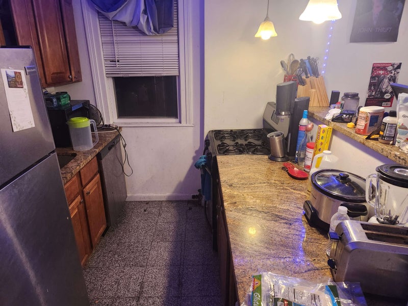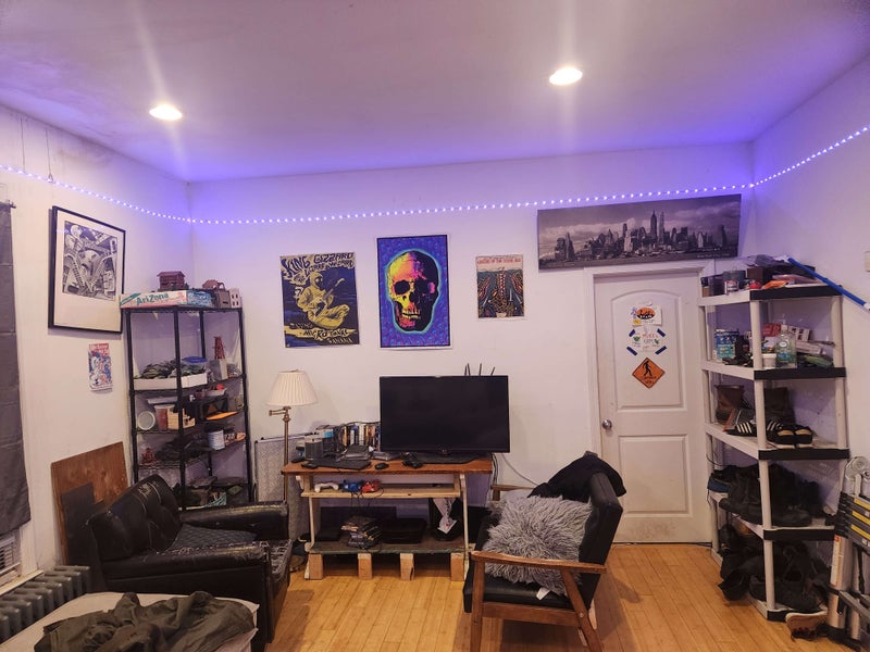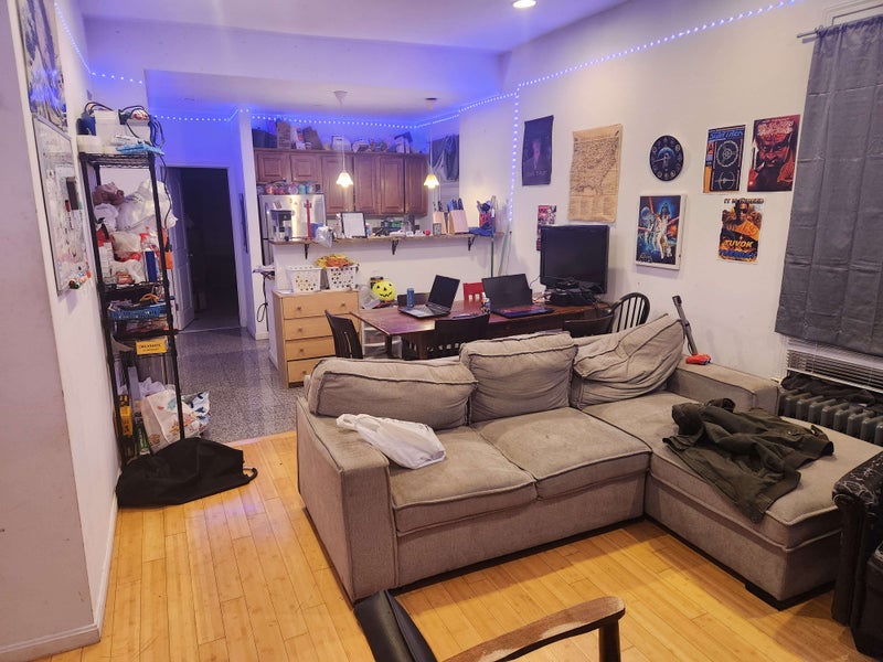 Room #4: A large room nestled in the back of the building, with access to the roof deck and courtyard via a stair case, with a locking door. Room is unfurnished, but apartment common areas are furnished. In unit, free laundry. Full kitchen with cookware. On street free parking outside of unit, as available.