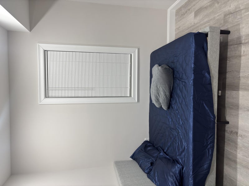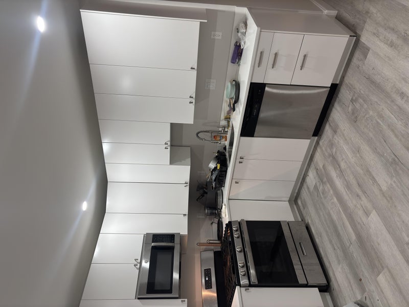 Clean, modern open-concept room with a seamless flow between the sleeping area, open closet, kitchen, and bathroom. Minimalist design, neutral tones, and sleek finishes create an airy, uncluttered space that feels intentional, functional, and effortlessly stylish.
