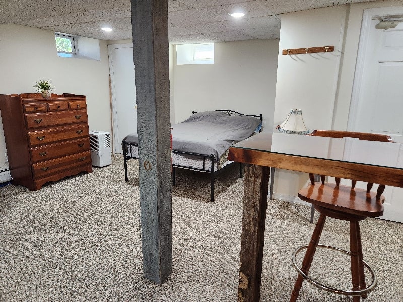**NON SMOKING** ***SINGLE OCCUPANCY ONLY*** Lower Level (basement) Studio: Very nice country setting with easy access to routes and . Sturbridge is known for its many specialty shops, restaurants and other entertainment such as the Old Sturbridge Village. Updated Studio with common entrance in a ranch style home. The studio is an open concept style, giving you many options of setup. There is a full functional kitchenette that contains a beautiful stainless steel sink with deep double bowls and stainless steel pull out gooseneck style faucet, feet of counter space with ceramic backsplash and a ceramicglass (burner) builtin cooktop. Stainless steel refrigerator, coffee maker, toaster and microwave included. Beautiful glass topped natural edge sawmill cut wood bar top and two swivel bar stools. Sofa, full size recent bed and recent deluxe hybrid type mattress. Full closet with shelf and light.. Furniture: Bed and Matt
