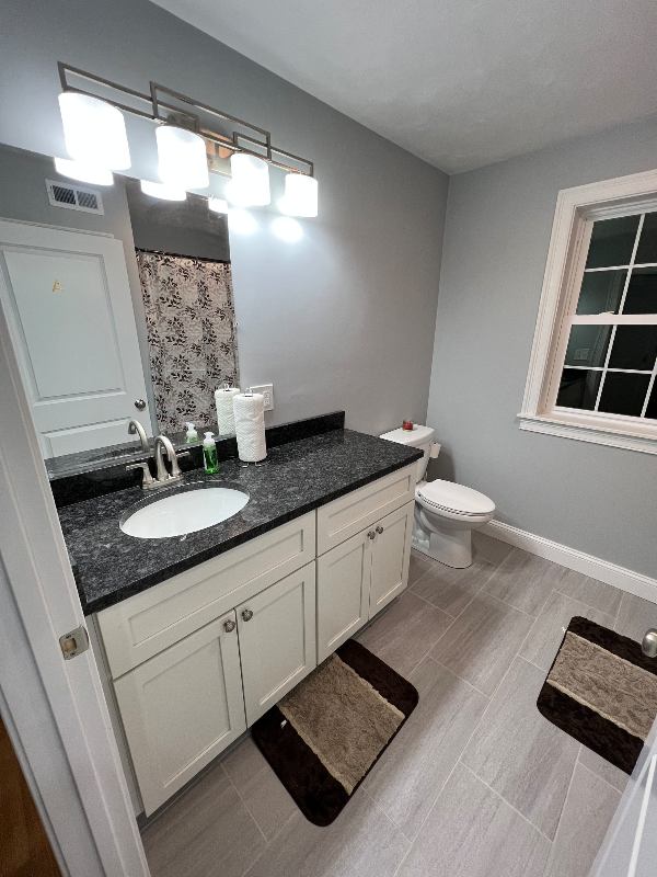 Bedroom and private bathroom in a fully furnished bedroom bathroom house. This house is a new construction.