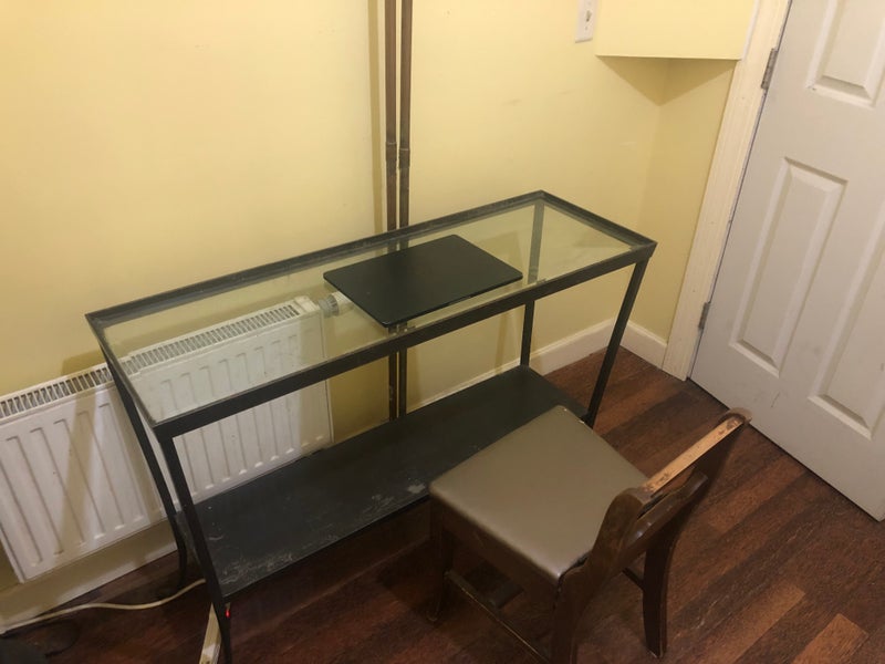 Nice $1,100 bedroom in a 3 bedroom, 2 bath apartment in Alphabet City. Pale yellow walls, dark hardwood floors, twin bed with white sheet. Furnished with glass-top desk, chair, and full-length mirror. Closet with hanging rod and shelf, window with curtains, and radiator. Furnished and move-in ready.