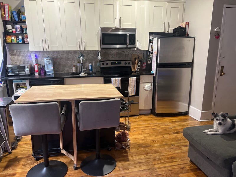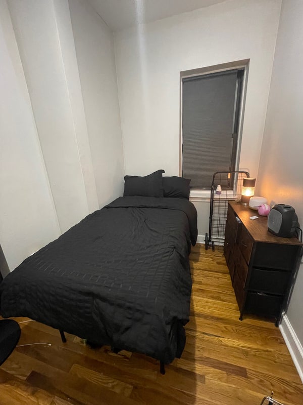 We have a large apartment and a good vibe going here - looking to fill one more space that just became available. I know it can sound like a full house, but two people are flight attendants and rarely home. The room is smaller (7x9) with a window and large closet. A queen size bed and a large dresser fit well. (A loft bed for more floor room would work as well.) You would share a bathroom with 1 male and 1 female. We have a separate kitchen and living room space that we share. It’s more spacious than it sounds so definitely come check it out! Laundry in building. Walk up but on second floor. Close to the 2/3 trains and a short walk to B/C as well. Located right above Central Park. Small dog does live here, super friendly. WiFi comes to an additional $18/month and electricity is split 5 ways (last month it was $36/person). We do apartment activities together occasionally but also sneak off to our own rooms for solo time. Girl, 25. Girl, 25. Boy, 27. Girl with dog, 41. Dog, 8. (Haha)