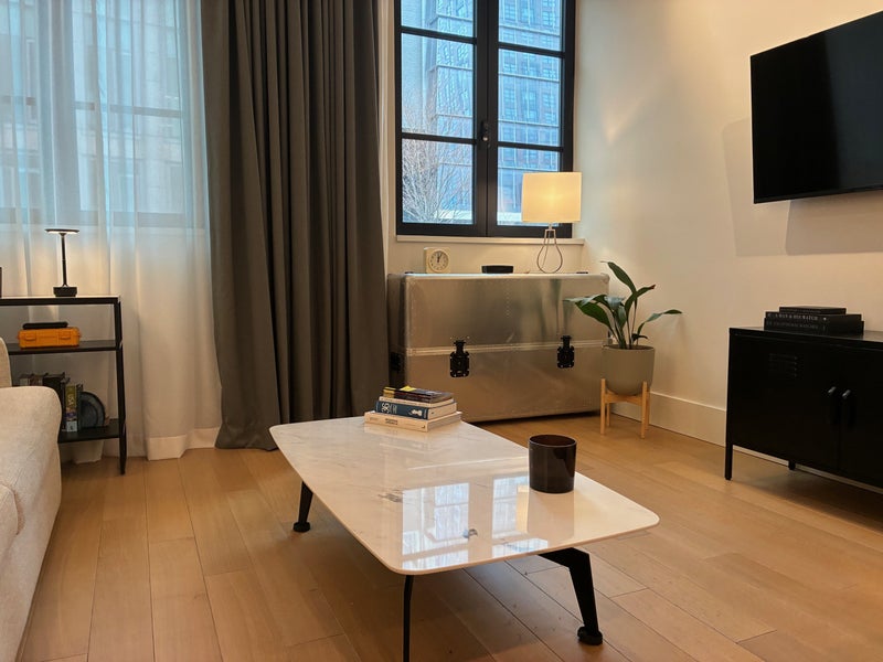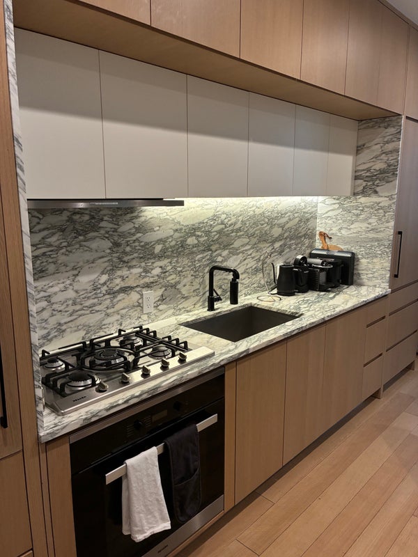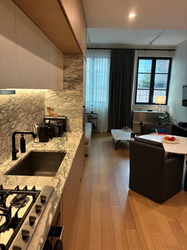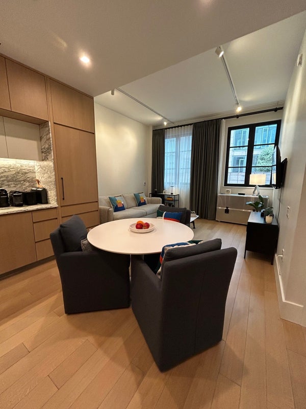 The building was initially built to be sold as condos, so the finishings are all really high quality (marble everywhere and well designed Miele appliances). There are only about 60 units in the whole building, so it's quiet and personal. There is a roof terrace, a private terrace on the ground floor, a gym and someone on front desk 24hrs a day. It's a clean and quiet area, right next to the top of the Highline, just south of Hudson Yards so you feel part of the Chelsea scene, but will all of the conveniences of Hudson Yards so close.