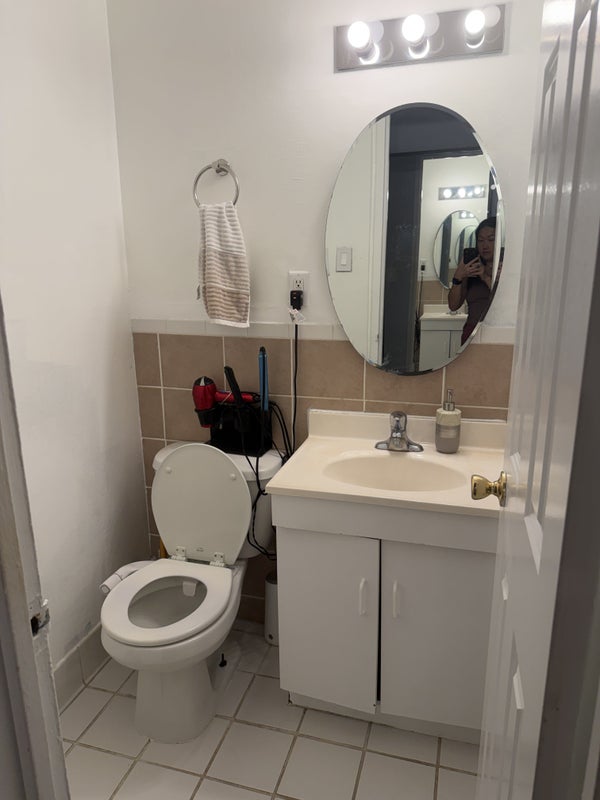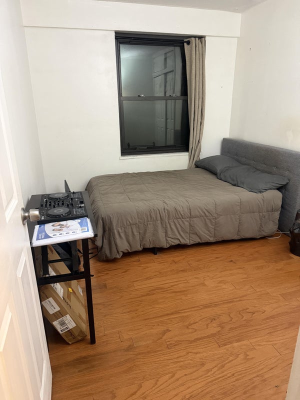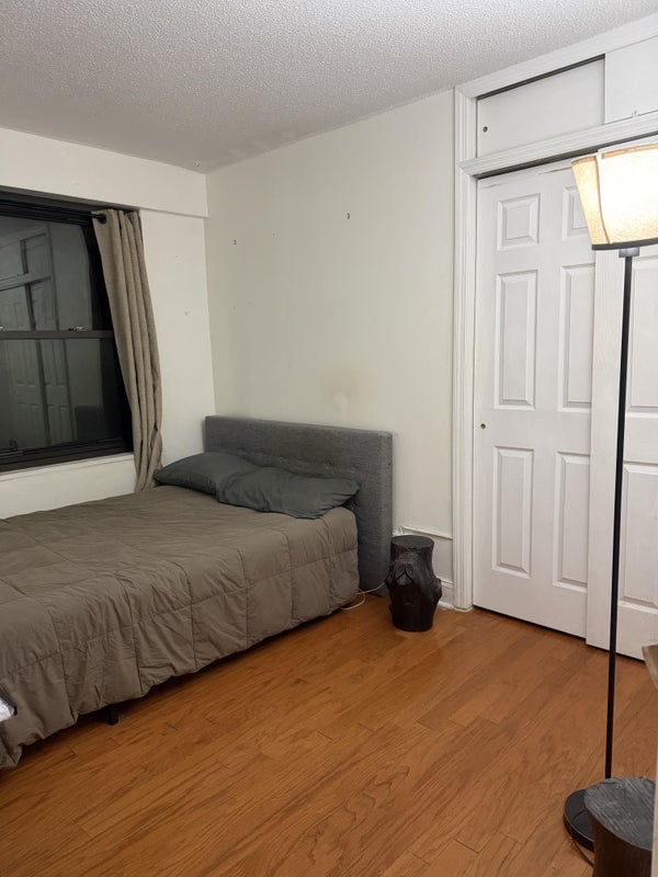 Size: 8.5ft X 11ft room available in a 4 bedroom, 1.5 bathroom unit. Nicely sized room that previously fit a full sized bed, dresser, desk and a has a closet with cabinets up top. Hardwood floors, nice window facing north with sweeping city views.