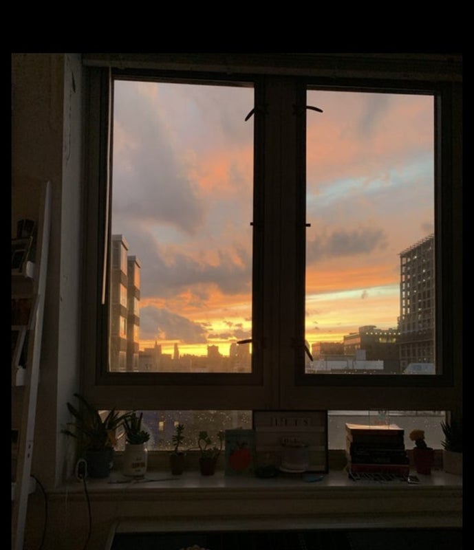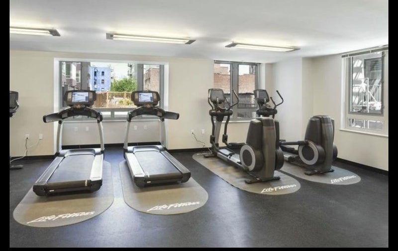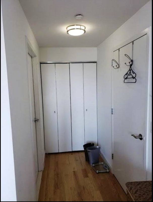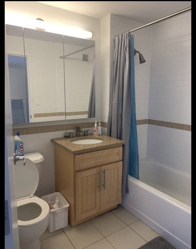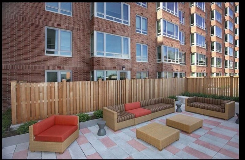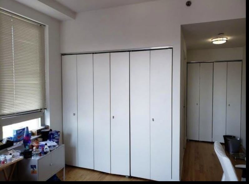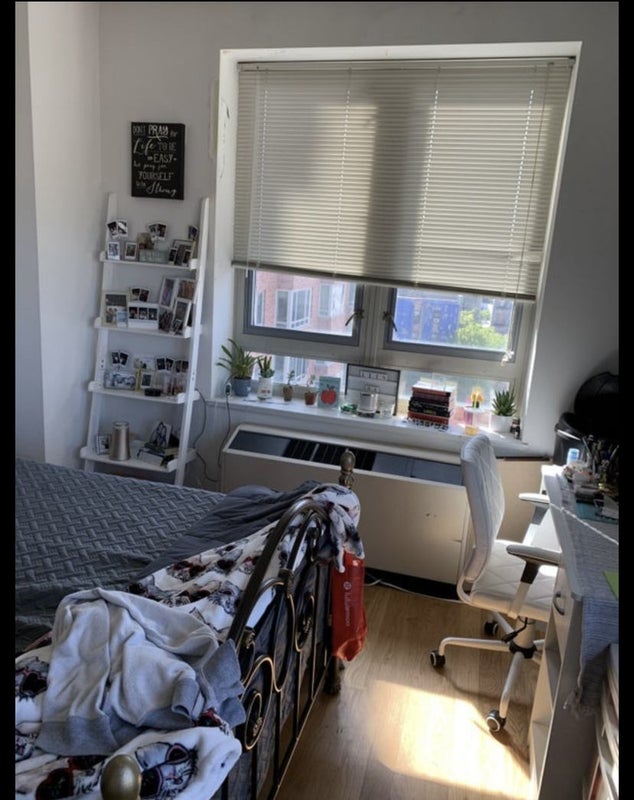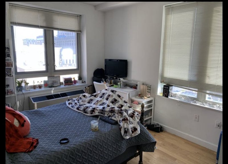 This room for rent is arguably the best room in the apartment. It is the main bedroom of the apartment and has its own PRIVATE BATHROOM, two huge closets and two huge windows. You would be living with two women in their early 30s who live well together. The unit has a washer and dryer and extra paid laundry in the basement. Room can come furnished with a desk, lamp storage, and bedframe things, or empty. The last three photos are of the building's outdoor terrace, lounge room, and gym!