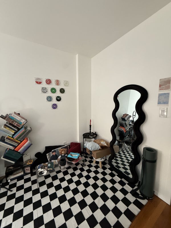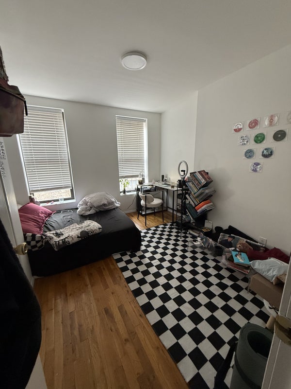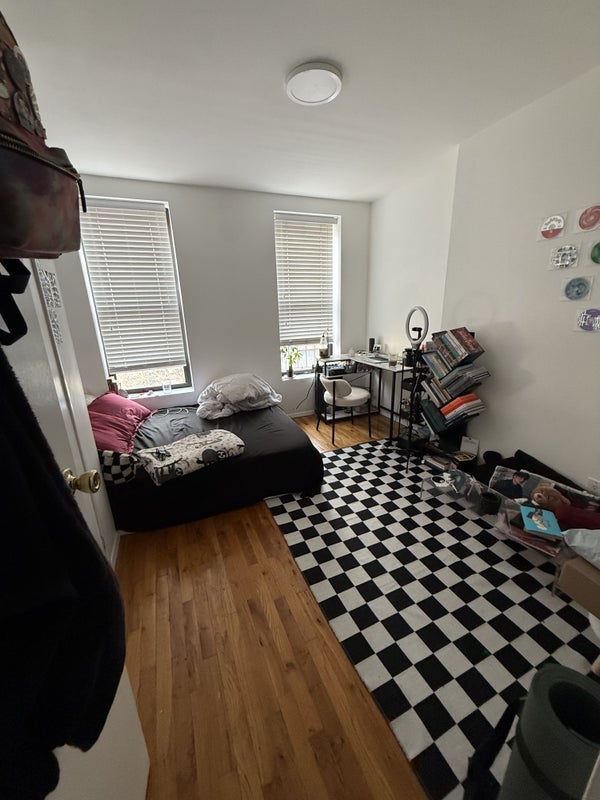 My current roommate is a friend and can be trusted. The apt is very clean and in good condition with a lot of space. It is the first room in the video that is available. I also uploaded pics of how the room currently looks. I uploaded a video from our original tour, so the tiles and wall paint have been redone, but the apt looks relatively the same. The room and closets are large. It can come with a queen-sized bed, desk, bookshelf, and body mirror if desired.