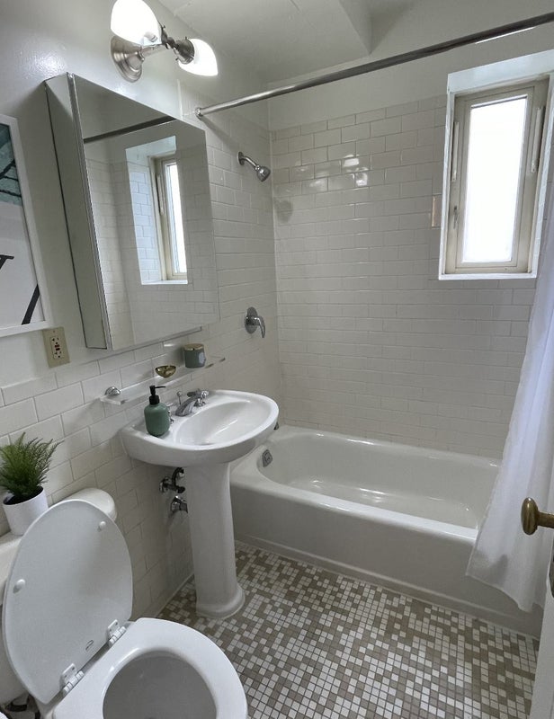 The bathroom is also spacious! In Stuytown, you get access to their manicured gardens and green space, plus exclusive access to 2 on-site gyms.
