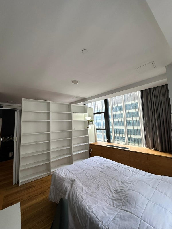 The room is separated from the rest of the suite by a modern bookcase partition. Please note: the divider does not fully reach the ceiling and has a small gap at the top, so while the space is private, it is not completely soundproof.