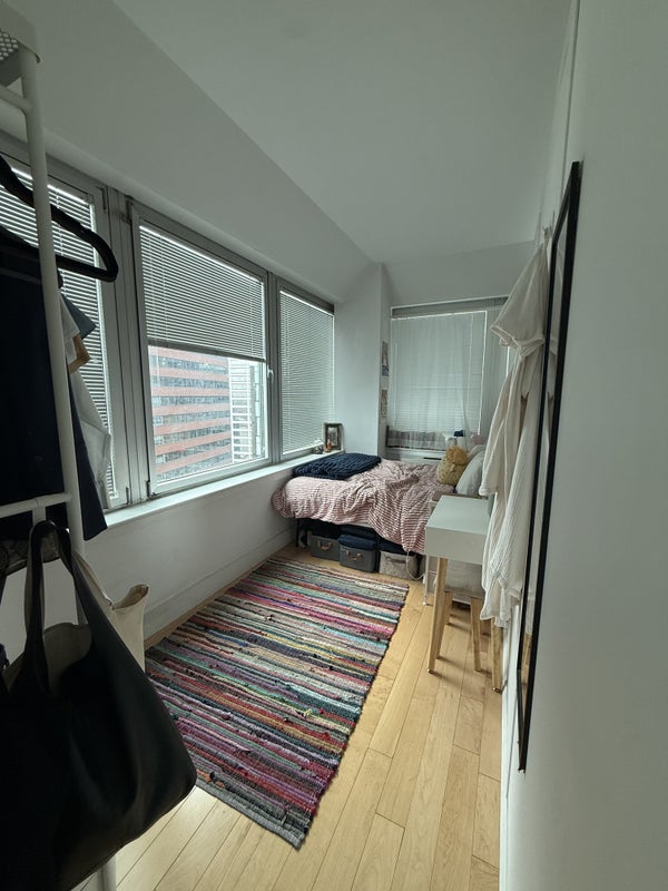 The room is a great size and gets amazing natural light, with beautiful views of the East River and the Brooklyn Bridge. I currently have a full bed and an open wardrobe setup. The room can be left furnished (for an additional cost) or unfurnished.