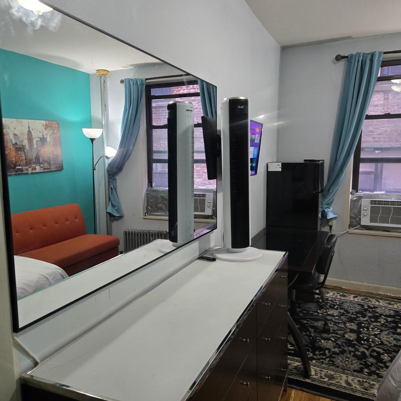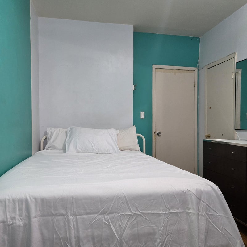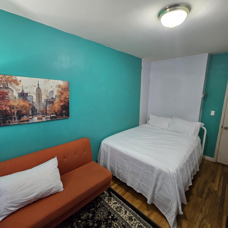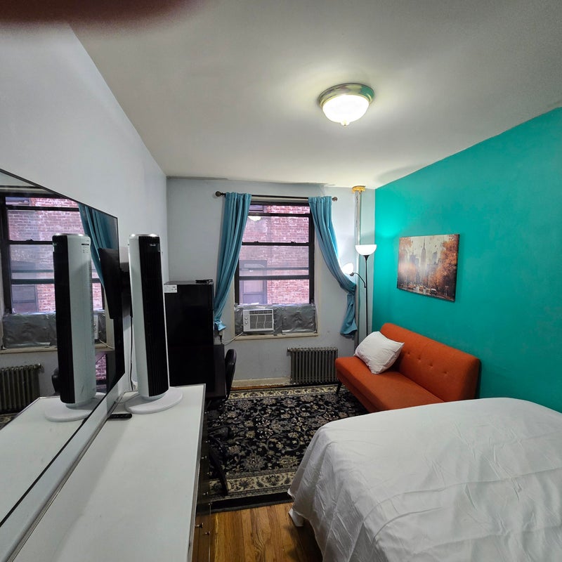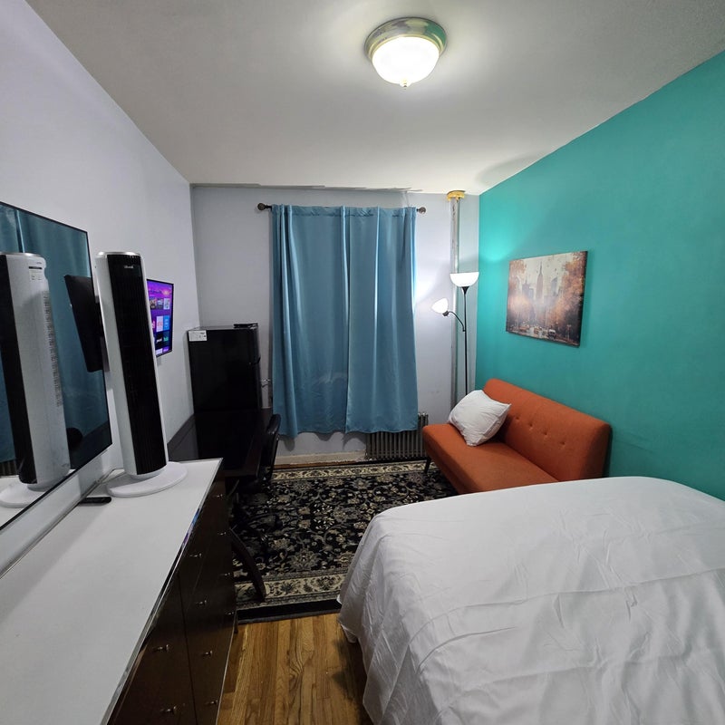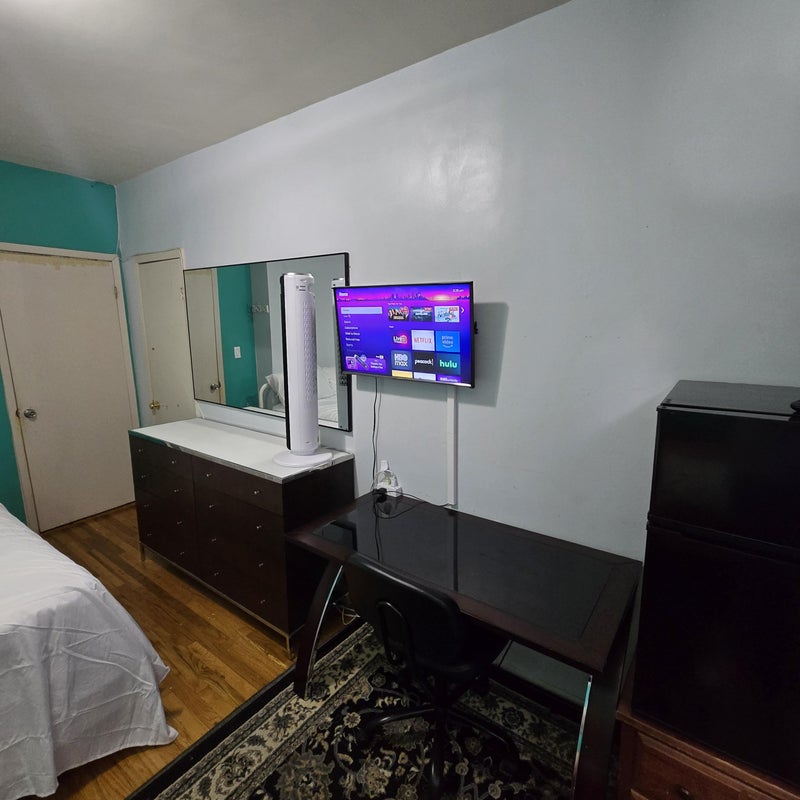 AVAILABLE NOW! A queen-sized furnished bedroom with a love-seat sofa, TV, dresser, AC, mini refrigerator, desk, and office chair is available. There is no living room, but there is access to the kitchen and a shared bathroom.
