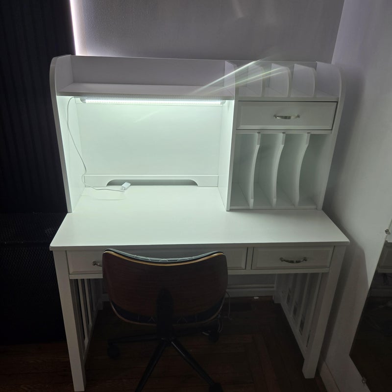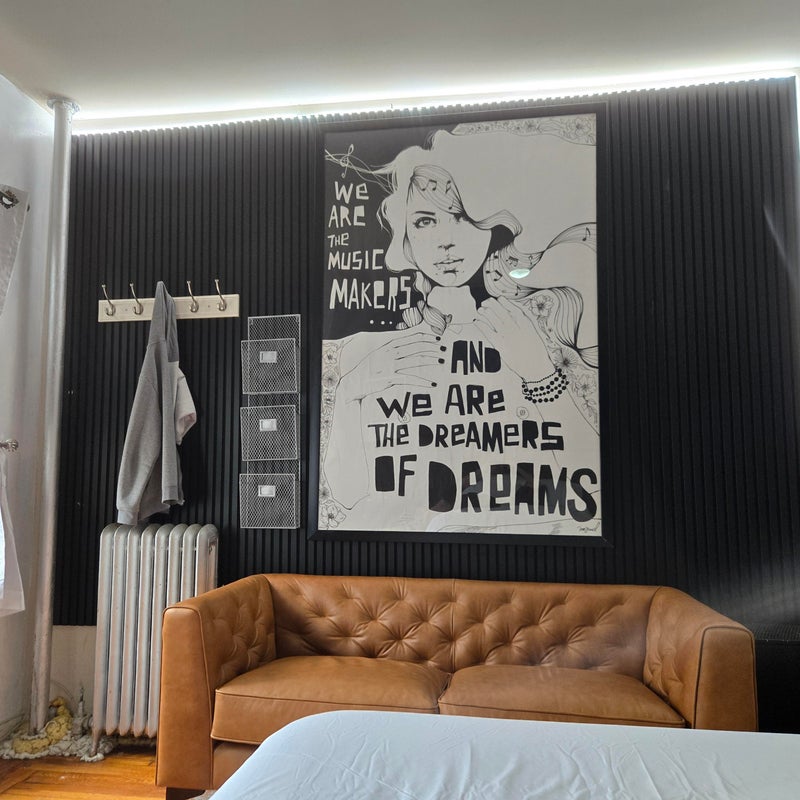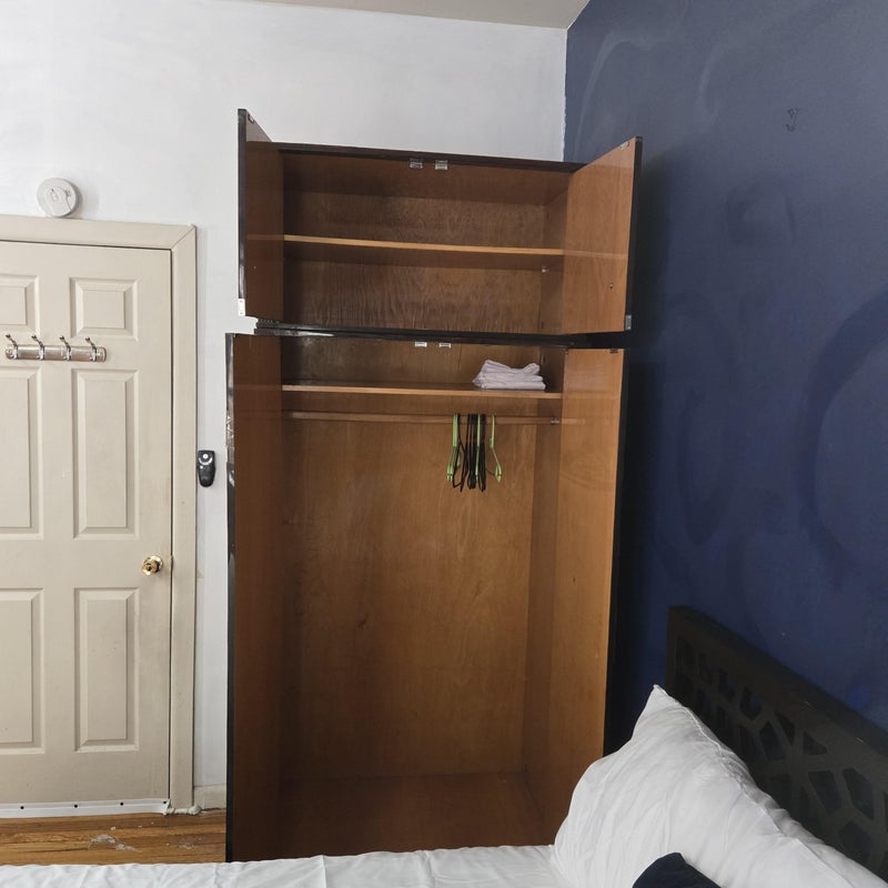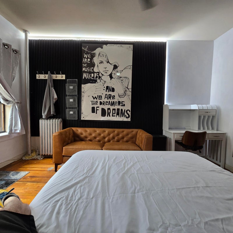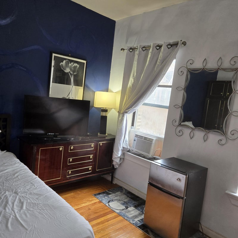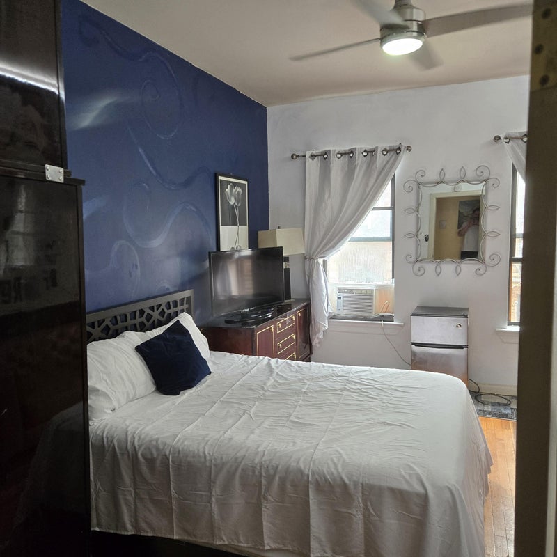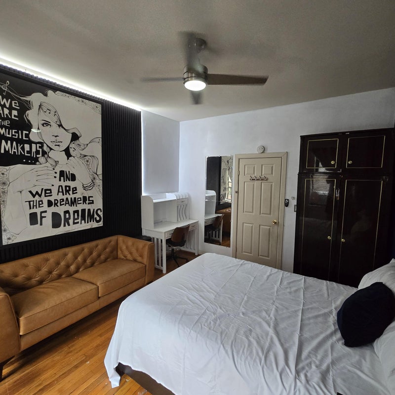 AVAILABLE NOW! A large queen-sized furnished bedroom is available, with a medium-sized desk with hutch, a dresser or media table, a large armoire, a leather apartment sofa, a Roku TV, a mini-refrigerator, AC, and two windows with lots of light facing the street. The best room in a great, quiet apartment.
