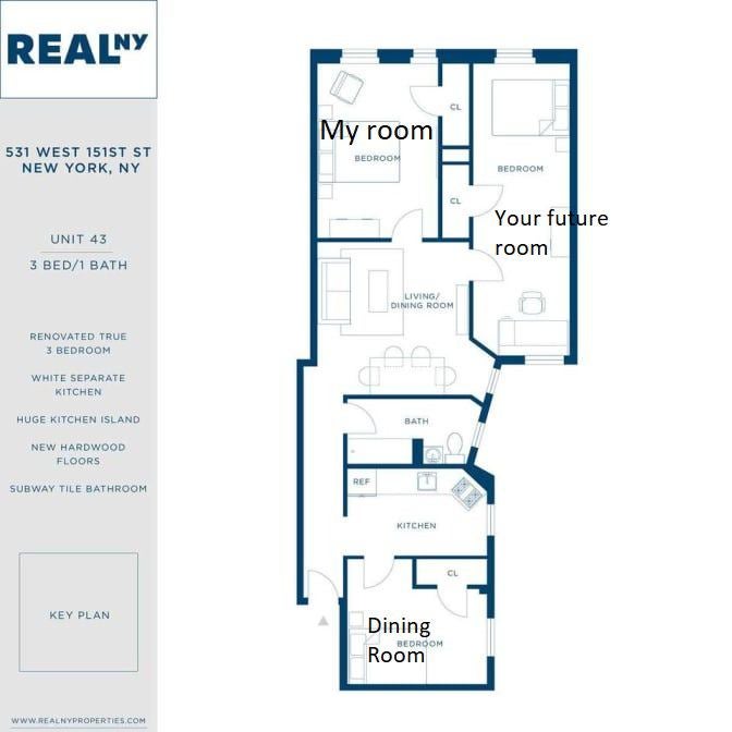 One bedroom available in a three-bedroom apartment, to share with one other roommate (the extra room is kept as a dining/guest room). Enjoy what the wonderful 10031 zip code has to offer, from great restaurants, parks, and fast transit to the rest of Manhattan. Close to the 1 Train, and AC/BD trains.