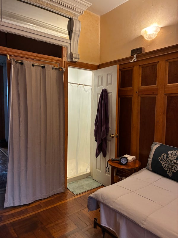 Quiet room at back of house with courtyard access. Private bath, single bed, desk, closet. Share kitchen, living room, dining room. Close to several trains and busses, bike lanes, parks. 2 blocks to City College, 15 min to Columbia U, Columbia Pres., 30 min to midtown. Text for virtual or in-person tour.