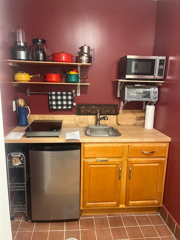 Kitchenette has: * Small fridge * Two-burner convection cooktop * Microwave oven * Toaster oven * Dishes, silverware, cups and glasses * Cooking utensils, pots, pans, etc. * French press coffee maker