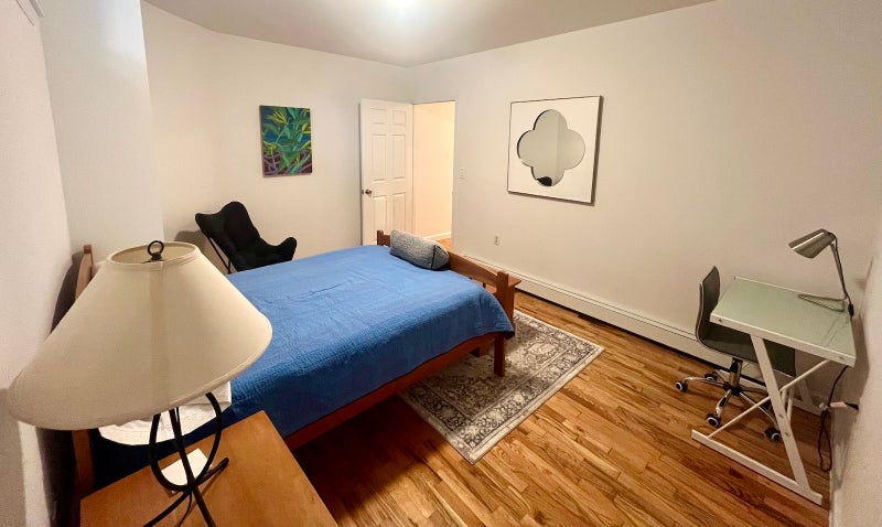 Middle Bedroom: * Shared bathroom with full tub/shower * Fully furnished * Full size bed * Keyed door lock * Clothes closet * Desk and office chair * Two sets of sheets * Towels and face cloths * Authentic artwork