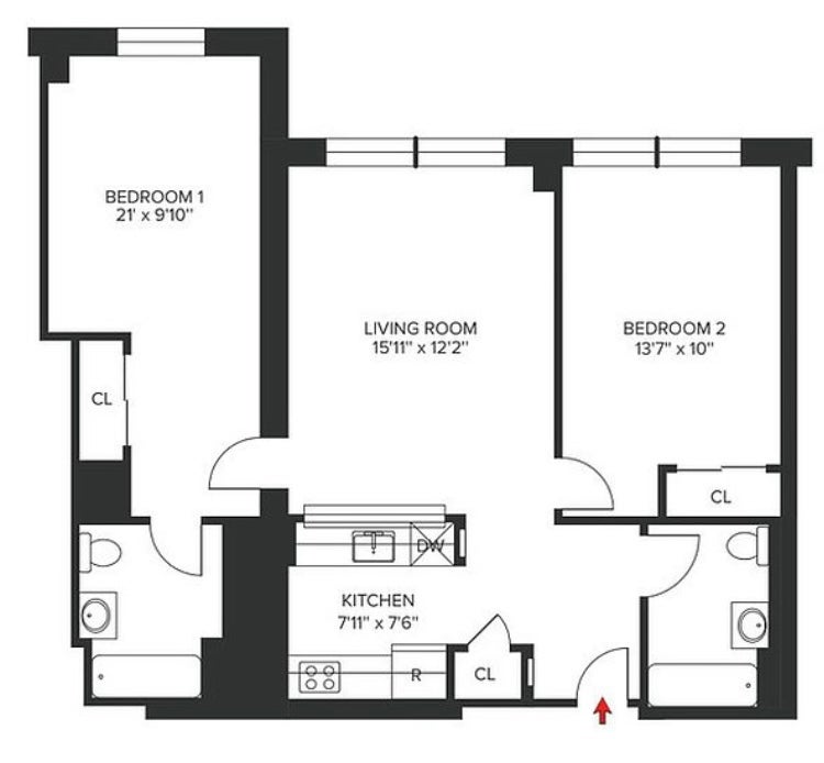 Large bedroom that can easily accommodate a King size bed ( 21' x 9'10"), with a private en suite bathroom in Hell's Kitchen. This is a 2 bedroom, 2 bathroom apartment with a large living room and modern appliances, including a washer/dryer in unit. The building also has a full time doorman, elevators and a gym.