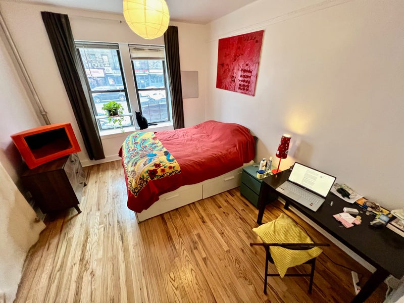 The room is spacious and full of natural light, furnished with a queen bed, a dresser, a desk, and an office chair (and a cat, who—depending on his mood and your energy—may occasionally double as a pillow).