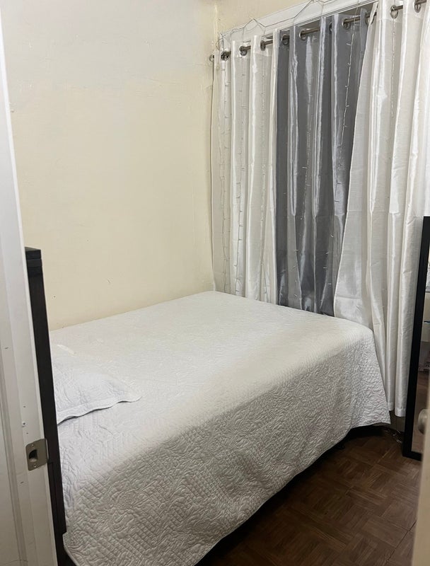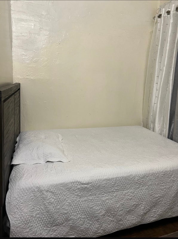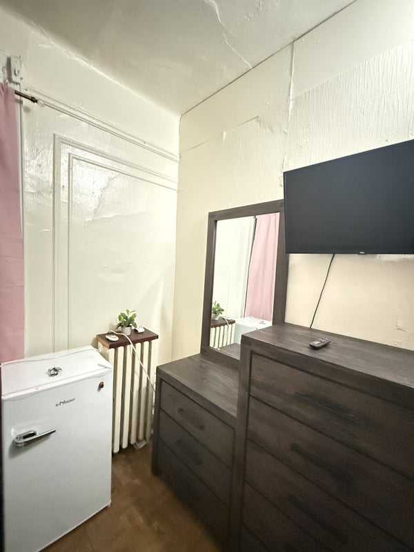 Fully furnished private bedroom available in Inwood. The room includes a full-size bed, dresser with mirror, mounted TV, window AC unit. A personal mini fridge is available upon request for an additional $10/week for added convenience. A small closet for storage is also available just outside of the room.