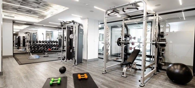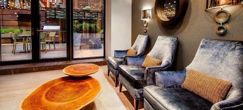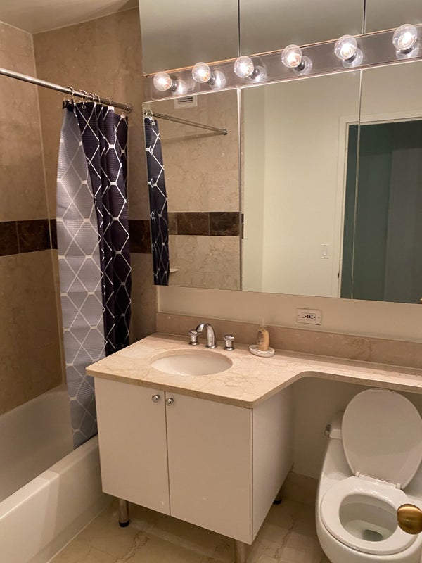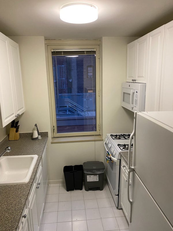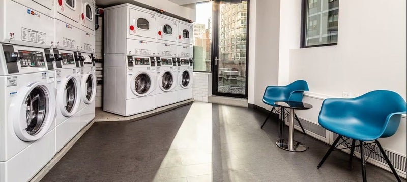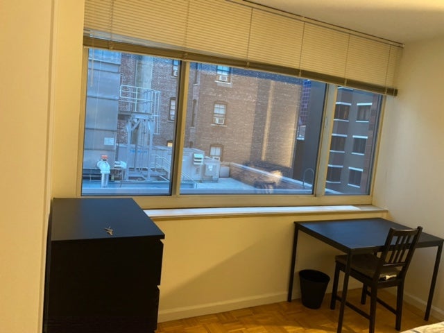 This room offers a comfortable layout with hardwood floors and a modern kitchen equipped with stainless steel appliances and a dishwasher. Residents enjoy amenities such as a 24-hour doorman, fitness center, indoor pool, rooftop sundeck, resident lounge, and on-site laundry. Located near the Theater District and Times Square, the building provides convenient access to major subway lines, restaurants, shopping, and entertainment throughout Midtown Manhattan.